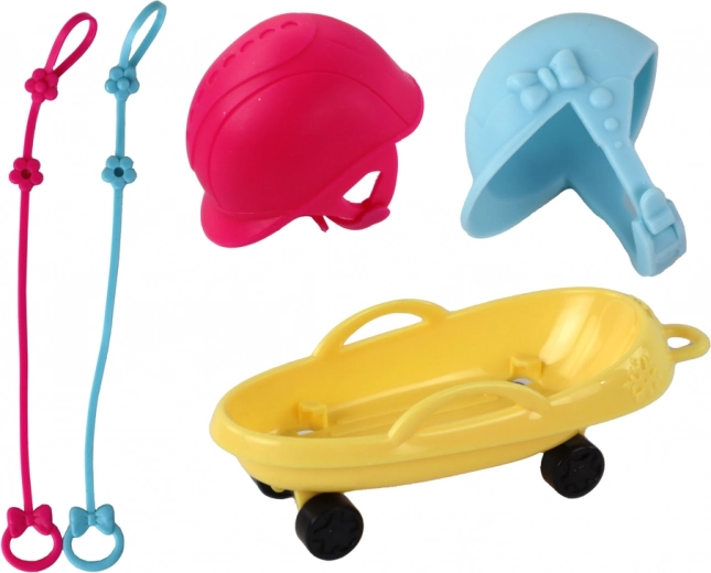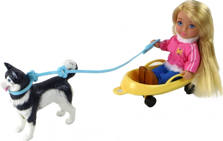 - Glavna lutka ANLILY, mala lutka, pes husky na povodcu, rumene sani/voziček, vijolični snežni skuter, drsalke, 2 čeladi, snežak, drobni dodatki
