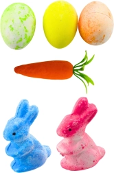 Ta komplet vsebuje barvna jajca, zajčke in korenje, kar mu daje klasičen velikonočni videz.