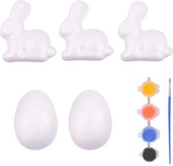Set vsebuje tri polistirenske zajčke in dve polistirenski jajci. Vključene so tudi štiri intenzivne barve in čopič, ki omogočajo enostavno in precizno barvanje.