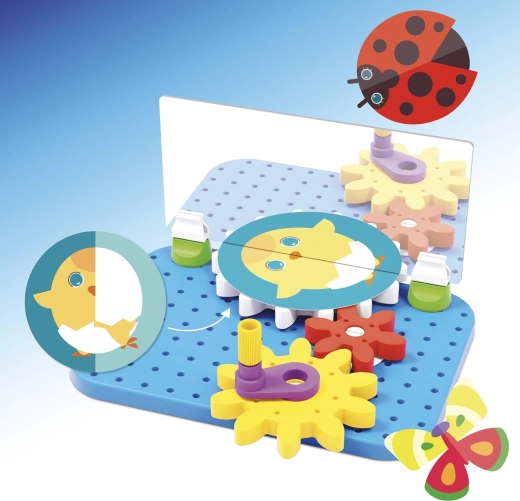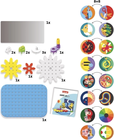 QUERCETTI MIRRORELLO je ustvarjalna izobraževalna igrača, ki povezuje gibanje zobnikov z izrazitim ogledalnim učinkom. Otroci vrtijo ročico, spravijo v gib barvna kolesa in opazujejo, kako se ilustrirane ploščice v ogledalu projicirajo v presenetljive, vedno nove vzorce. Zabava, ki hkrati uri koordinacijo oko–roka in spodbuja domišljijo.