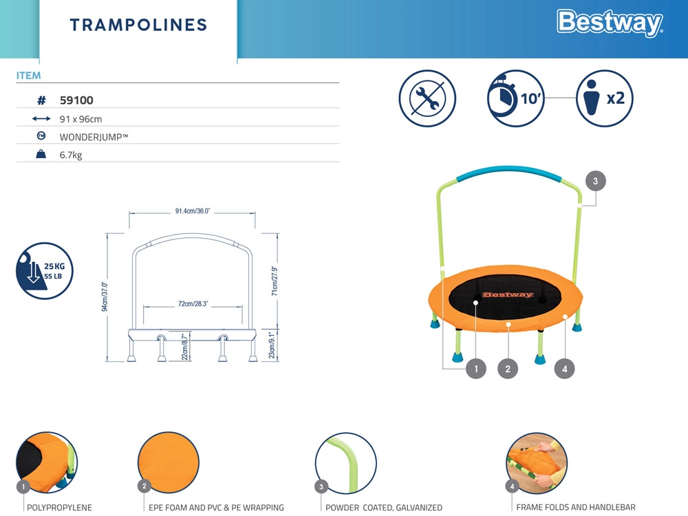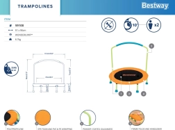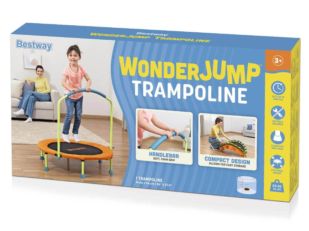 Visokokakovostna trampolina Bestway Wonderjump je zasnovana za uporabo v zaprtih prostorih in na prostem. Zahvaljujoč stabilni in trpežni konstrukciji zagotavlja varnost in udobje pri uporabi. Je idealna izbira za vse, ki želijo izboljšati kondicijo, koordinacijo gibov in splošno telesno pripravljenost.