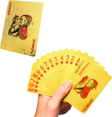 Vstopite v svet čustveno nabitih iger z zlatimi plastičnimi kartami. Ta komplet je idealen za klasične igre, kot so poker, makao ali tisoč. Njihova zlata zasnova vsem igram doda pridih razkošja, hkrati pa zagotavlja trajnost zaradi odporne plastične strukture. So popolna izbira za večere s prijatelji ali družino ali kot dovršeno darilo za ljubitelje kart.