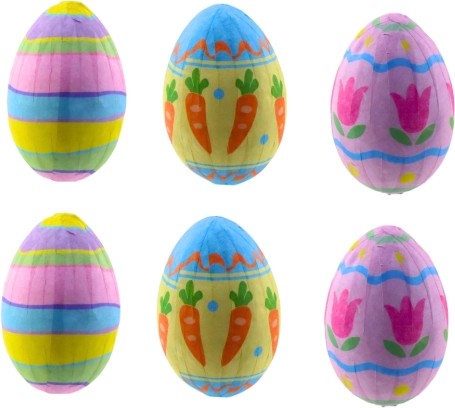 Dekorativna jajčka ponujajo igrive motive cvetlic in korenja v živahnih barvah, ki poživijo vsako velikonočno okrasitev.