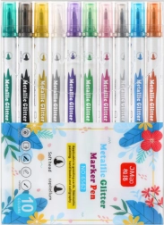 Ti kovinski flomastri z bleščicami vašim projektom dodajo izrazit sijaj in globino. Dvostranska zasnova omogoča preklapljanje med natančnimi detajli in polnimi potezami – idealno za ročno pisavo, okraševanje voščilnic, scrapbooking in šolske projekte. Kovinski učinek z nežnimi bleščicami izstopa na svetlih in temnih podlagah.