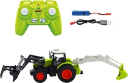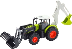 Realistično izdelan traktor v merilu 1:24 združuje kmetijska in gradbena dela v enem. Sprednja žlica je vrtljiva, zadnje roko lahko uporabite kot majhen bager, LED luči pa dodajo privlačen učinek tudi v somraku. Gumijasta kolesa in delno kovinska konstrukcija zlahka preneseta intenzivno igro doma in na prostem.