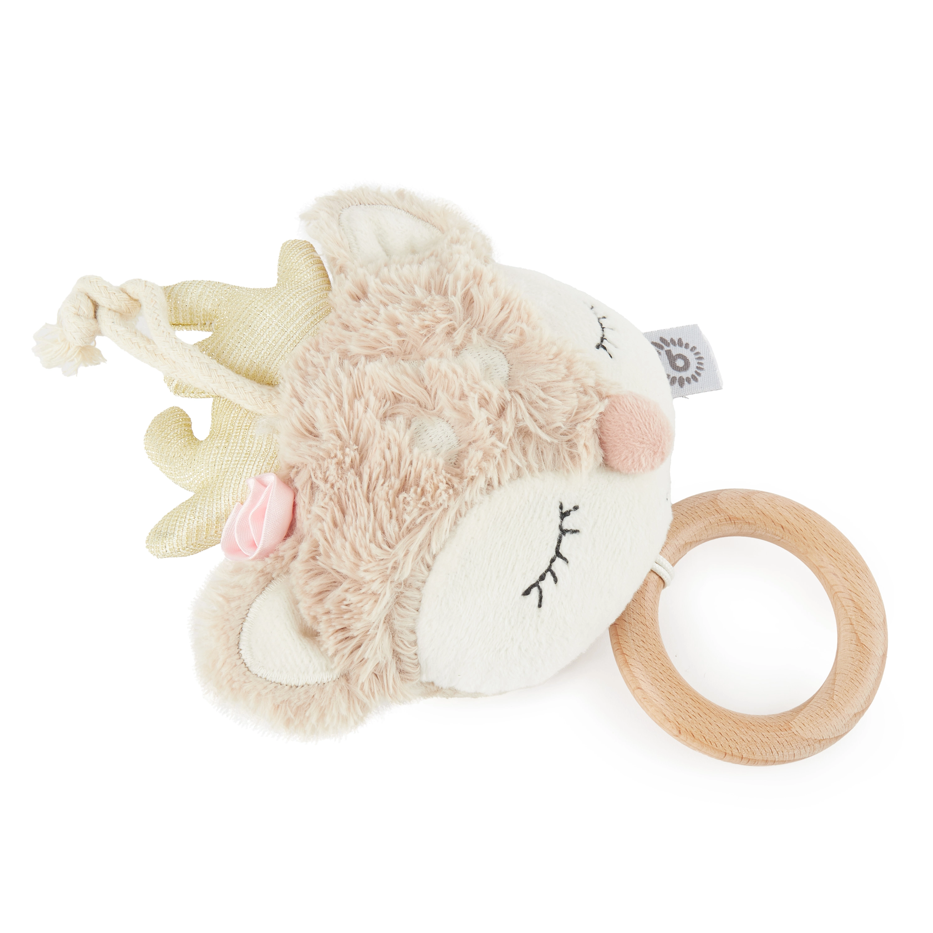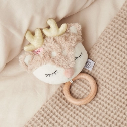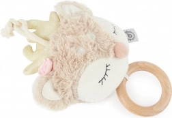 Mehka tekstila je prijetna na dotik in vabi k prijemanju, kar podpira senzorični razvoj najmlajših. Zahvaljujoč praktičnim vrvicam igrača ostane na posteljici, vozičku ali avtosedežu – skratka povsod, kjer vaš malček potrebuje pomiritev.