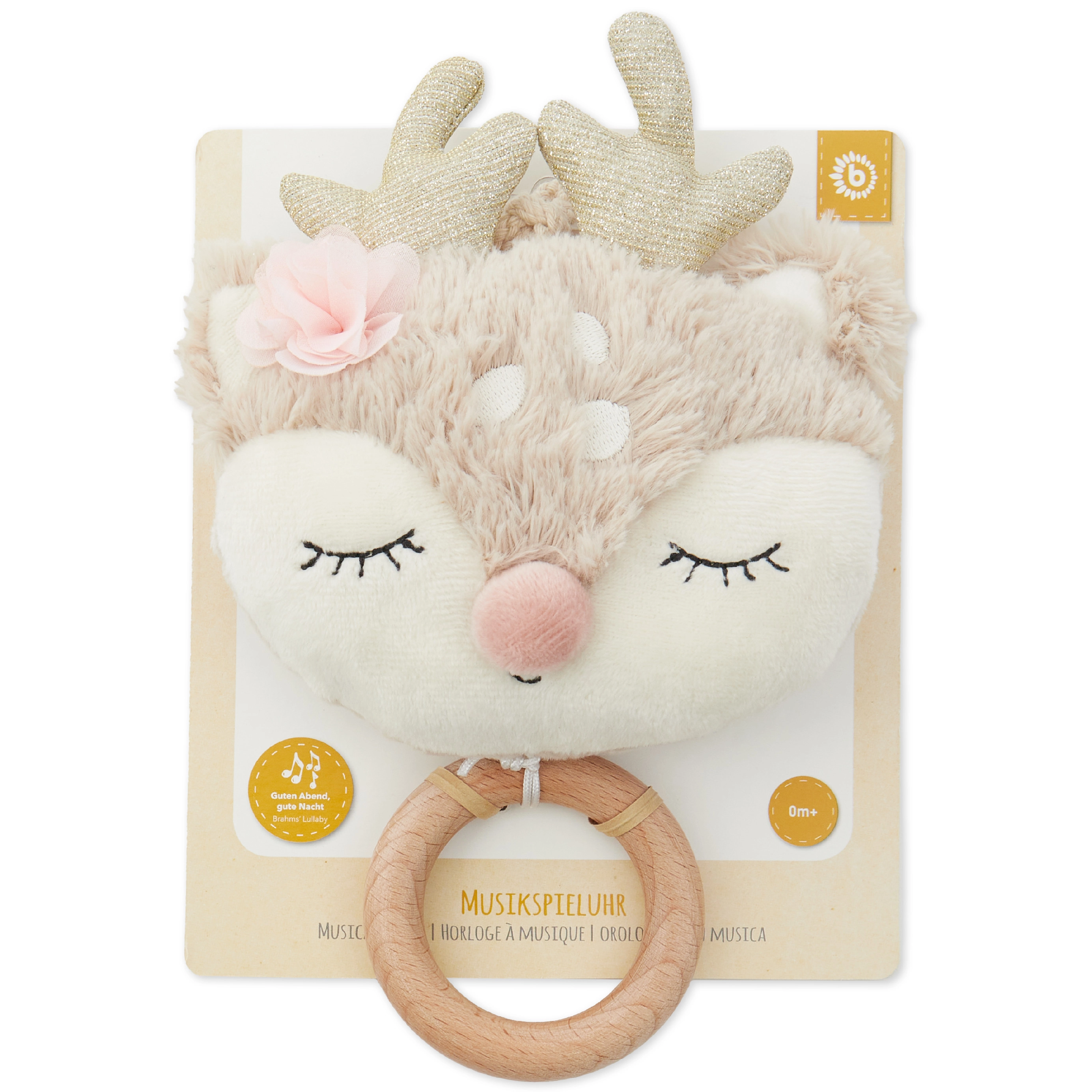 Z vrvicami igračo hitro pritrdite na posteljico, voziček ali avtosedež. Leseni obroček služi za udobno navijanje glasbenega mehanizma.