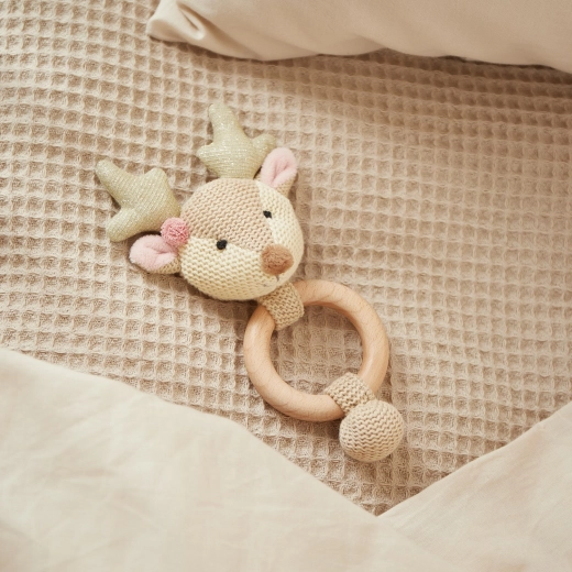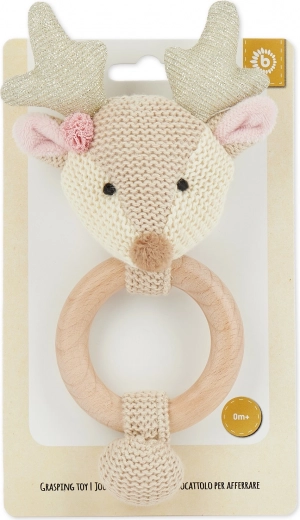 Ljubka srnica znamke Bieco združuje ropotuljico, prijemalno igračo in grizalo v enem. Naravni les in mehka bombažna tkanina ponujata prijeten kontrast za senzorični razvoj, nežno ropotanje spodbuja sluh, grizalo pa lajša nelagodje ob izraščanju prvih zobkov.