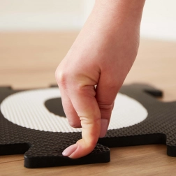 Penasta igralna podloga BIECO z motivi abecede združuje varnost, udobje in učenje. Zaradi približno 1 cm debeline učinkovito blaži udarce in ščiti pri igri na trebuhu, plazenju in prvih korakih. Minimalistična black & white izvedba se poda vsakemu interierju.