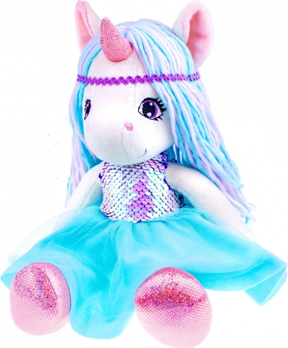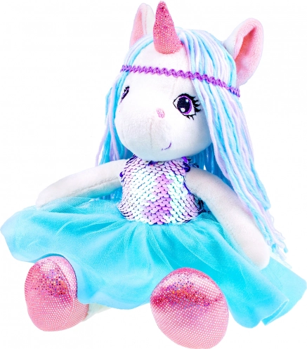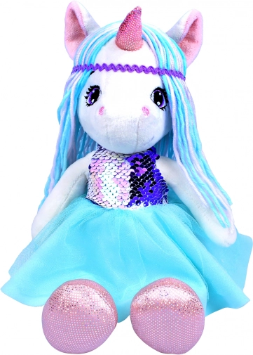 Prisrčna plišasta punčka samorog v modrih tonih očara otroke z mehko izdelavo in bleščečimi detajli. Ima nežne pastelne laske, bleščeč bleščičast (flitro) življenik/top, tilasto krilce in bleščeča kopitca – idealna za cartanje in domišljijsko igro.