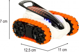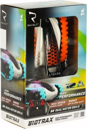 REVOLT BIOTRAX je mini terenski gosenicni model, ki se odlično znajde na različnih površinah – od preproge do trate. Robustno plastično ohišje in gumijaste gosenice zagotavljajo odličen oprijem in vzdržljivost, medtem ko LED učinki poudarijo vsak trik in nočno vožnjo.