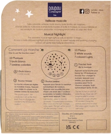 Nežno uspavajte svojega malčka s to prisrčno glasbeno skrinjico Zajček, ki združuje ljubko plišasto igračo z projekcijo vesolja v 7 barvah ter ponuja 10 nežnih melodij in 5 pomirjujočih zvokov.