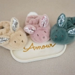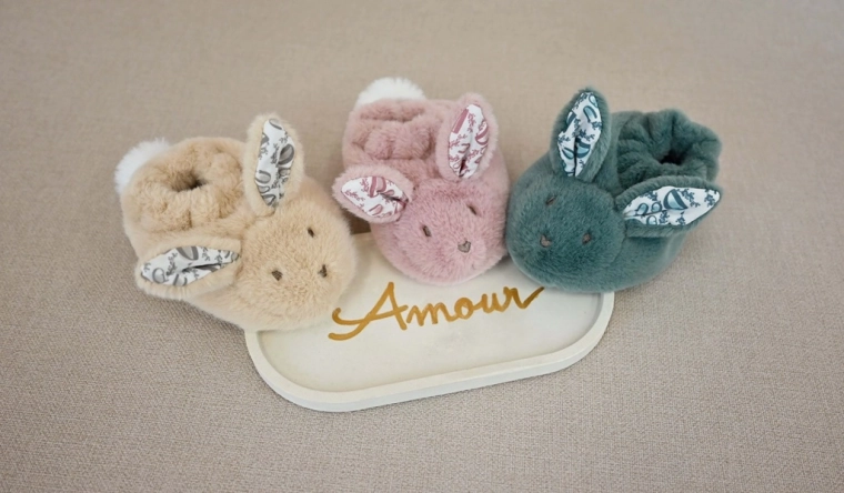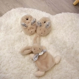 Podarite svojemu otroku občutek miru in varnosti s tem kompletom, ki vsebuje ne le plišastega zajčka z elegantno pentljo, temveč tudi copatke s potiskom zajčjih ušesk in izvezenim obrazkom.