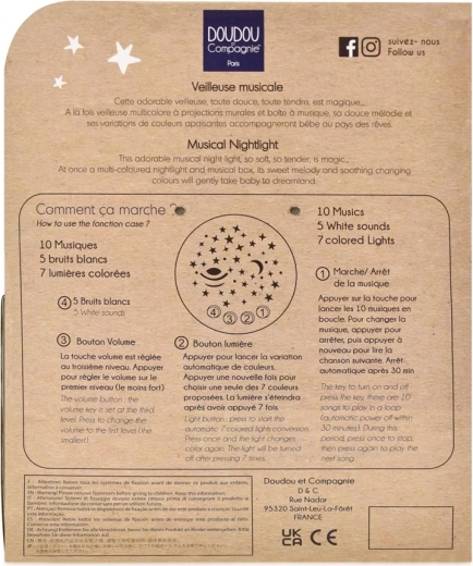 Zajček ni le odličen za crkljanje, temveč tudi funkcionalen dodatek otroški sobi. Njegove 7-barvne projekcije in 10 melodij omogočajo prilagoditev izkušnje individualnim potrebam vašega dojenčka. S štirimi gumbi lahko preprosto upravljate glasnost, načine predvajanja in barvne projekcije.