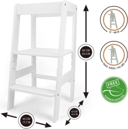 Odkrijte čar te bele učne stolpe, ki je bila narejena iz visokokakovostne vezane plošče z maksimalno nosilnostjo do 50 kg. Z možnostjo nastavitve višine ploščadi na 34, 40,5 ali 47 cm se popolnoma prilagodi rasti in potrebam otroka.
