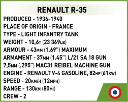 Zvesto izdelan RENAULT R-35 s kakovostnimi, trpežnimi potiski ter možnostjo izbire poljskih ali francoskih emblemov za največjo avtentičnost.
