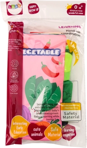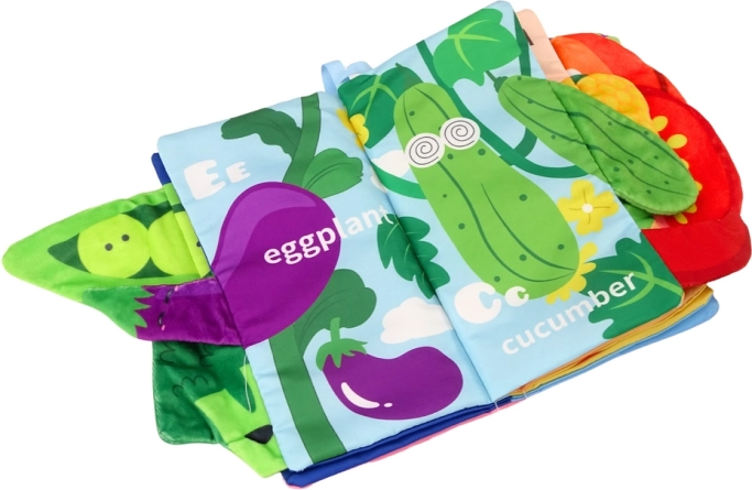 Ta mehka, varna in trpežna tekstilna knjižica je idealna prva knjiga za dojenčke. Ponuja kontrastne barve, zvočne učinke (šumenje in piskanje) ter izbočene detajle zelenjave, ki vabijo k dotiku in raziskovanju. Zaradi napisov v angleščini naravno podpira razvoj besedišča in razumevanje sveta.
