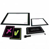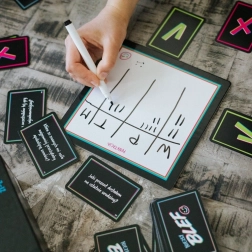 - 312 kartic z vprašanji, 24 kartic za glasovanje, tabla za zapisovanje odgovorov, tabla za vodenje rezultata, suhi flomaster, navodila