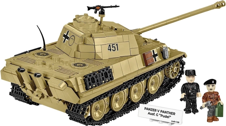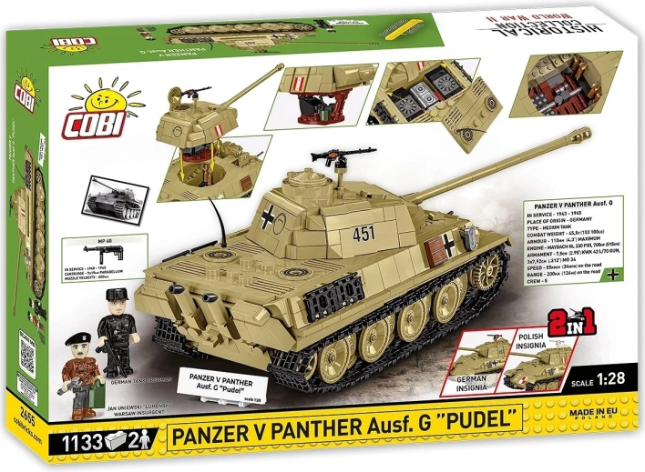 Ustvarite zvest model legendarnega tanka Panzer V Panther Ausf. G „Pudel“, ki se je zapisal v zgodovino med dogodki leta 1944. Ta gradbeni komplet COBI bo razveselil zbiratelje ter ljubitelje zgodovine in tehnike: ponuja natančen videz, trdno konstrukcijo in številne funkcionalne podrobnosti, zaradi katerih model ne le odlično izgleda, temveč tudi navdušuje pri gradnji in igri.