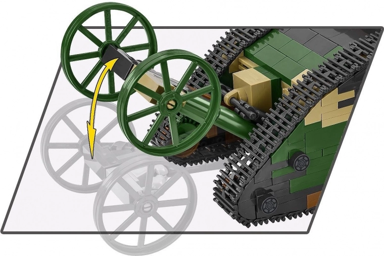 Iz 878 kosov sestavite podroben tank Mark I (Male) z avtentično kamuflažo, trajnimi potiski in dolžino 28 cm – idealen za vitrino in igrive rekonstrukcije.