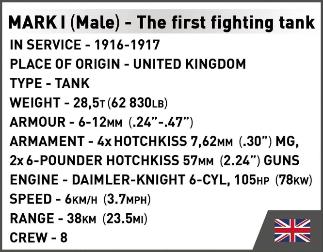 Zgradite pionirja oklepne tehnike iz obdobja Velike vojne. Podroben konstruktor COBI Mark I (Male) v merilu 1:35 ponuja avtentično kamuflažo, natančne proporce in kakovostno izdelavo s potiski, ki se ne obrabijo. Model je odličen za igro in razstavljanje ter prinaša tudi izobraževalno vrednost zaradi povezave z zgodovino in The Tank Museum.