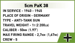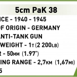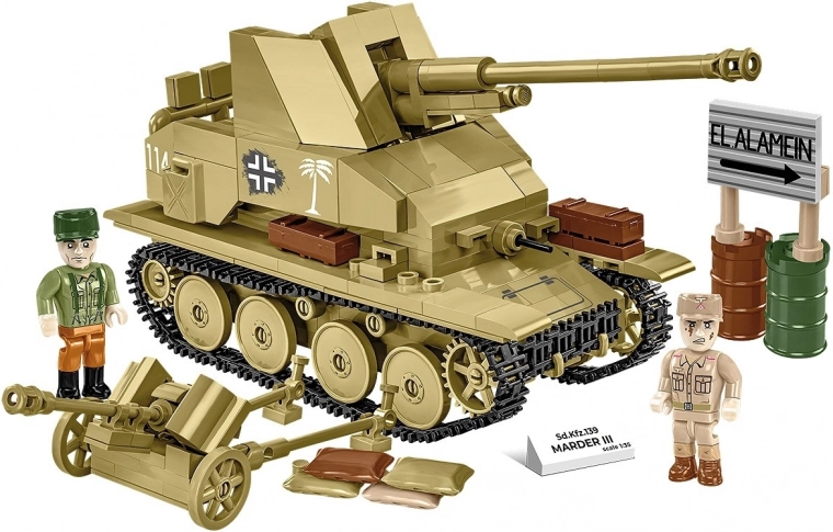 Del kompleta so dve figurici (nemški mehanik in topničar), poljsko topništvo 5 cm Pak 38 ter smernik EL ALAMEIN, navdihnjen z zgodovinskimi fotografijami. Komplet je izdelan v EU, izpolnjuje varnostne standarde in je v celoti združljiv z drugimi znamkami gradbenih kock.