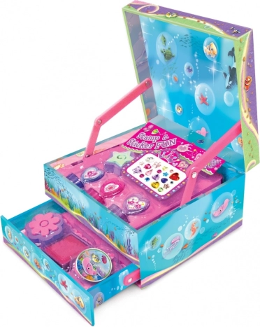 Kreativni set za male in velike ljubitelje ustvarjanja: set štampiljk z motivom morske deklice v darilni škatlici–škatlici za nakit z samosamodejnim predalom. Dovolj je, da dvignete pokrov, in predal se sam odpre – udobno in zabavno.
