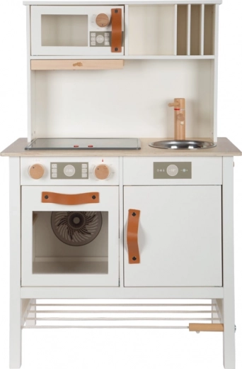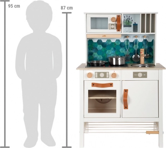 Ta moderna lesena kuhinjica SMALL FOOT Tasty izstopa z robustno konstrukcijo, čistim skandinavskim videzom in premišljenimi funkcijami za realistično igro kuhanja. V kompletu so kovinsko korito, vrtljivi gumbi z mehanskim zvokom, elektronska kuhalna plošča s svetlobnimi in zvočnimi učinki ter praktična vlečna napa s svetlobnim simbolom.