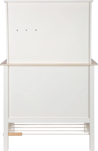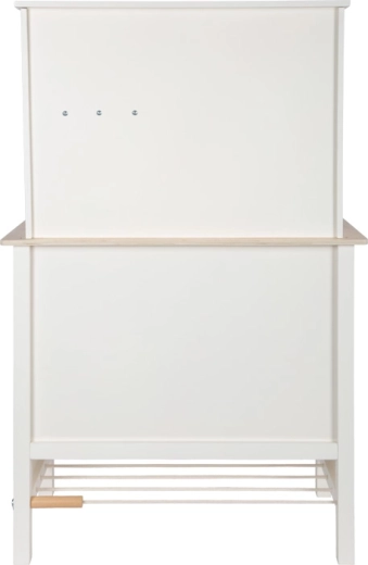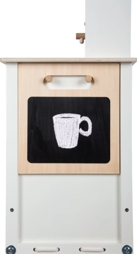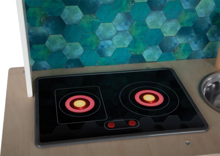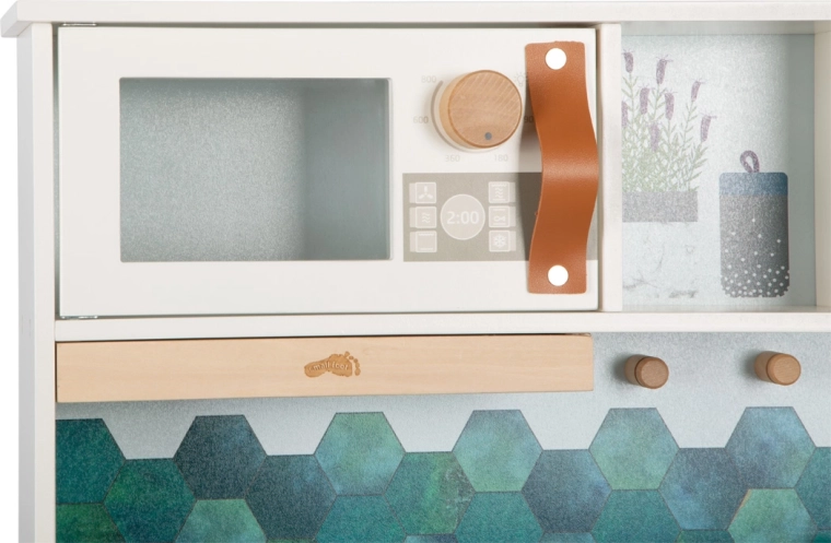 Otroke bo razveselila bogata oprema: lonec s pokrovko, ponev in kovinski kuhinjski pribor. Odstranljiv pekač služi tudi kot tabla za risanje, hladilnik in pečica pa imata potiskane notranje površine za še več zabave. Zadnja plošča je dvostranska – izberite dizajn heksagonalnih ploščic ali povsem belo površino, ki se poda v vsak interier.