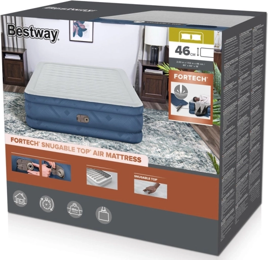 Napihljiva postelja BESTWAY je izdelana iz trpežnega materiala Tough Guard Fortech, ki združuje prožnost PVC-ja s trdnostjo tkanine. Mehak flokast površinski sloj je prijeten na dotik, ne drsi in povečuje udobje spanja. Stabilna konstrukcija Wave Beam enakomerno porazdeli težo in preprečuje posedanje.