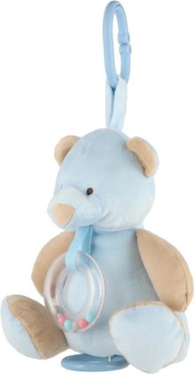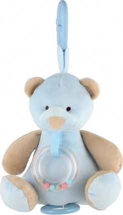 Prisrčen moder medvedek z glasbenim/rožljajočim elementom in obesnim sponkom pomiri dojenčka doma in na poti. Je zelo mehak, varen za otroke in se zaradi nežnih barv poda v vsako otroško opremo. Prosojni obroček z bunkicami nudi zvočno stimulacijo, sponka omogoča enostavno obešanje na voziček ali avtosedež, prijeten pliš pa spodbuja uspavanje.