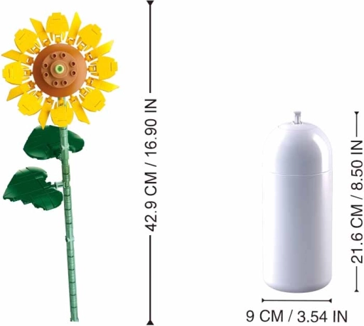 Ta dizajnerski komplet sončnice bo vašo polico ali pisalno mizo spremenil v razcveten kotiček, ki nikoli ne uvene. S precizno oblikovanimi koščki in preglednimi navodili sestavite realistično cvetlico z listi ter čisto belo vazo. Robustna ABS plastika zagotavlja dolgo življenjsko dobo in vzdržljivost, zato boste v estetskem modelu uživali dolga leta.