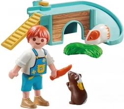 Odkrijte svet hišnih ljubljenčkov z igralnim setom PLAYMOBIL, v katerem deček z ljubeznijo skrbi za dva prisrčna morska prašička. Pisano obarvana hiška za glodavce s skrivališči, stopnicami in toboganom ponuja veliko možnosti za igro in izmišljanje novih zgodb. Priloženi so tudi dodatki za hranjenje, vključno s korenčkom, šopom trave in napajalnikom.