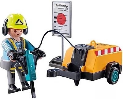 Vsebina pakiranja: 1 figura gradbenega delavca, kompresor, pnevmatsko kladivo, prikolica z vlečnim kavljem, opozorilni znaki, rokavice in odstranljiva čelada. Odlično za male graditelje, ki imajo radi akcijsko in ustvarjalno igro.