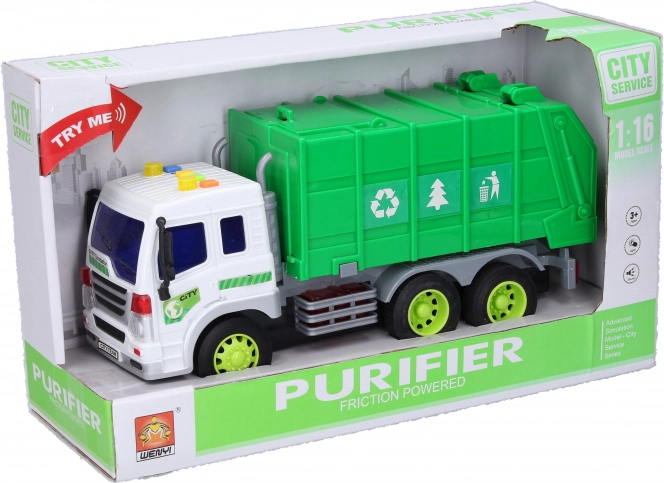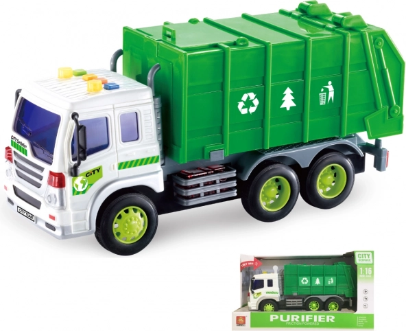 Predstavljamo vam igračo, ki bo navdušila ne le malega voznika - smetarski avto z efekti. Ta avto dolžine 28 cm je opremljen z vztrajnostnim mehanizmom, kar pripomore k daljši in bolj realistični igri.