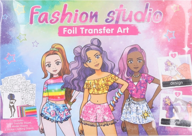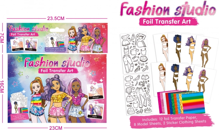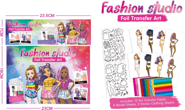 Odkrijte svojo ustvarjalnost z oblikovalskim portfeljem, ki vsebuje 8 modelov, 2 lista predlog oblačil in 12 barvnih lepilnih folij.
