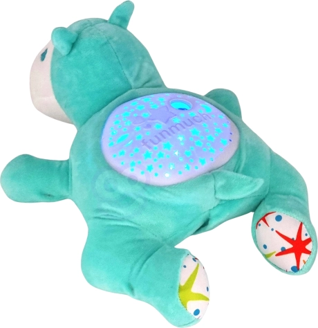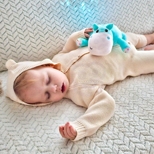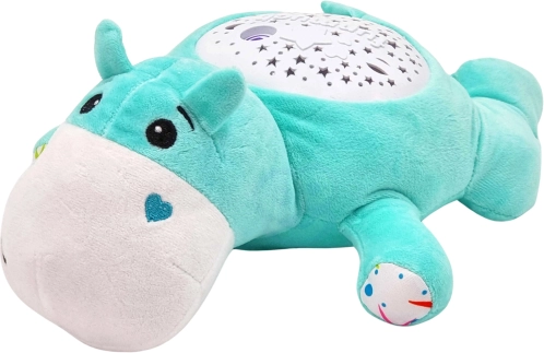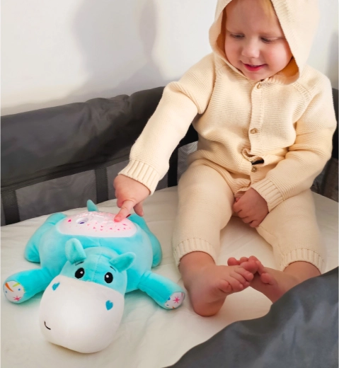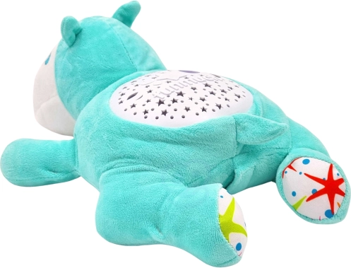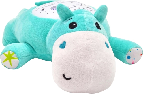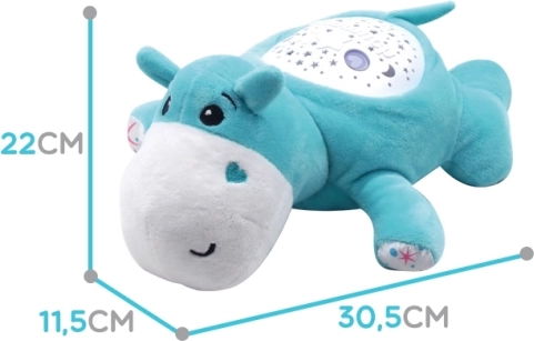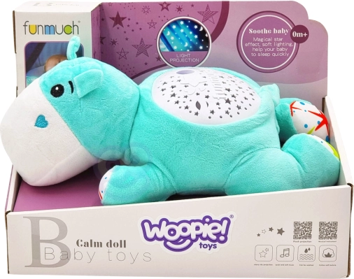 Plišasti povodni konj WOOPIE BABY pred spanjem ustvari prijetno vzdušje z nežno svetlobo projektorja in relaksacijskimi uspavankami z naravnimi zvoki. Lučke mehko spreminjajo barve in projicirajo zvezde, luno in planete, kar otrokom daje občutek varnosti.