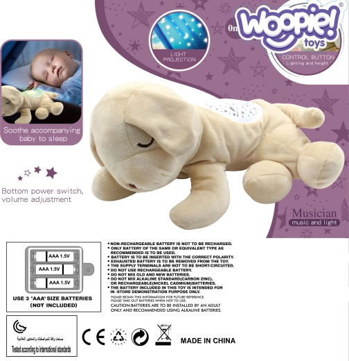 Glasbeni modul predvaja več uspavank do 20 minut v kosu, zato otrok lahko mirno zaspi brez ponovnega zagona. Upravljanje je preprosto – gumb na trebuščku za svetlobo in glasbo ter 2 stopnji glasnosti za idealno glasnost v otroški sobi. Mehkužno telo je napolnjeno z mehko vato, mehanizem pa lahko preprosto odstranite za varno pranje.