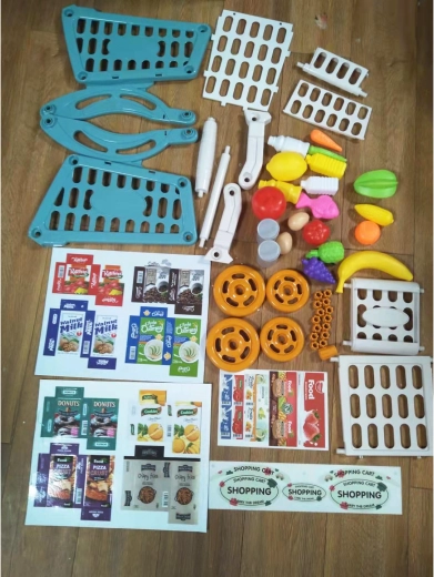 Otroški nakupovalni voziček s 56 kosi živil. Enostavna montaža s slikovnim priročnikom, mere 40 × 24,5 × 44 cm. Odlična igrača za male trgovce.