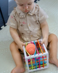 Od prvih prijemov do samostojnega razvrščanja – kocka motivira k eksperimentiranju in postopno razvija spretnosti.