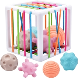 Ta senzorična kocka z elastičnimi trakovi je idealen pripomoček za otroke, ki radi odkrivajo svet z dotikom. Mehke like z različnimi površinami otroci zlahka zagrabijo, stisnejo in potisnejo skozi elastične trakove. Igra naravno razvija fino motoriko, tip in koordinacijo, hkrati pa krepi potrpežljivost in logično razmišljanje.