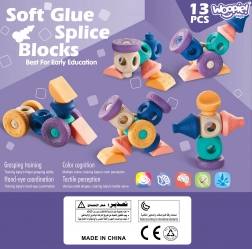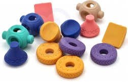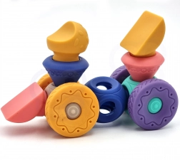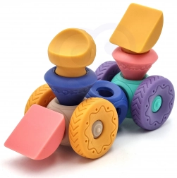 Dele je mogoče preprosto povezovati in sestavljati v različne konstrukcije – od preprostih stolpov do zabavnih vozil, kot je »dirkalni avtomobilček«. Komplet je idealen za igranje, učenje in grizenje v obdobju izraščanja zob. Praktična embalaža v kartonski škatli z okencem iz njega naredi odlično darilo za dojenčke od 6 mesecev.