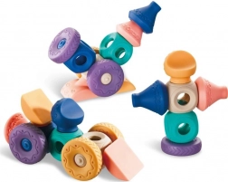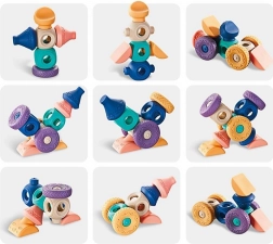 Dele je mogoče med seboj povezovati in zlagati v različne konstrukcije – od stolpov do zabavnih vozil. Igra spodbuja domišljijo in fino motoriko.