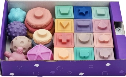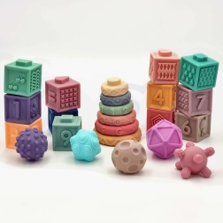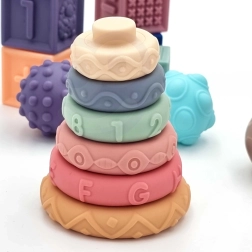 Mehak silikon z različnimi teksturami, barvami in oblikami spodbuja tip, vid in sluh. Kvadratne kocke ob stisku zapiskajo in motivirajo k nadaljnjemu raziskovanju.