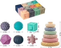 Ta vsestranski komplet združuje tri tipe igrač: kvadratne senzorične kocke s 6 različnimi stranicami, stapelne prstane in mehke žogice z raznolikimi površinami. Otroke pritegnejo barve, oblike in varno piskanje ob stisku pri kvadratnih kockah. Reliefne številke in matematični znaki spodbujajo naravno učenje štetja in preprostih operacij.