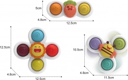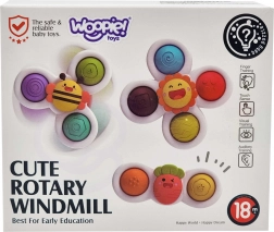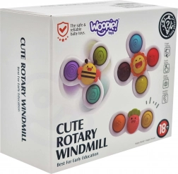 Komplet WOOPIE vsebuje tri prikupne spinnerje v obliki sončka, čebelice in korenčka. Zahvaljujoč vzdržljivim ležajem se igrače vrtijo gladko in dolgo, medtem ko barvni gumijasti elementi vabijo otroke k stiskanju in odkrivanju različnih tekstur. Priseski omogočajo, da igrače enostavno pritrdite na gladke površine – okno, ploščice, kad ali mizo.