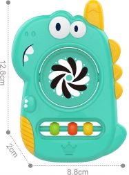 Igrača je primerna od rojstva in ne vsebuje ostrih robov. Različne teksture in barve spodbujajo senzorično zaznavanje, medtem ko obroč s kroglicami motivira otroka k prijemanju in stresanju, s čimer krepi fino motoriko. Praktična velikost omogoča, da grizalo vzamete s seboj kamor koli – v voziček, avtosedež in na igralno podlogo.