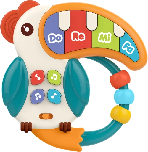 Pelikan Woopie je idealna prva glasbena igrača za najmlajše. Zahvaljujoč barvnim tipkam s toni »Do, Re, Mi, Fa« otroci zlahka odkrivajo svet glasbe, medtem ko z drsenjem kroglic in pritiskanjem gumbov urijo fino motoriko ter koordinacijo oko–roka. Mehki greben in lok s koluti hkrati delujeta kot grizalo za olajšanje ob izraščanju zobkov.