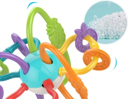 Ta igrača je varna za otroka, saj ne vsebuje ostrih robov in ima mehke dele, ki jih je mogoče uporabiti kot grizalo. Podpira razvoj čutov dotika, vida in sluha zahvaljujoč ropotuljici, ki pritegne pozornost. Prilagodljive zanke omogočajo premikanje nameščenih barvitih elementov, kar je odlično za razvoj motorike.