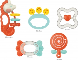 Komplet Woopie senzoričnih ropotuljic in grizal je odličen pomočnik za vašega malčka pri izraščanju zob. Ta igralni komplet ne le pomirja občutljive dlesni, temveč tudi aktivno podpira razvoj vida, sluha in tipa. Popolno za dojenčke že od prvih tednov življenja, vsebuje pet različnih igrač, od katerih ima vsaka edinstveno obliko in teksturo.